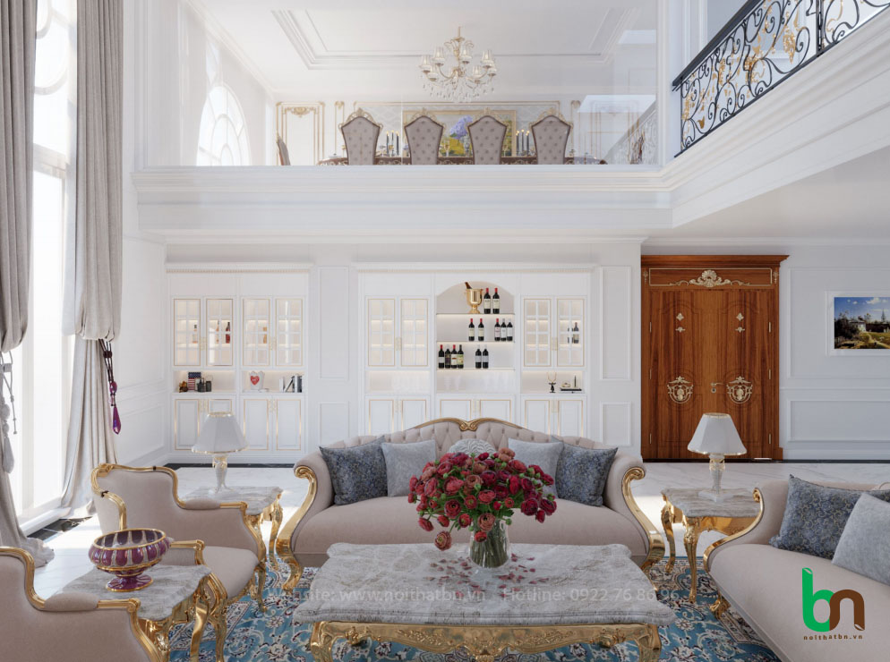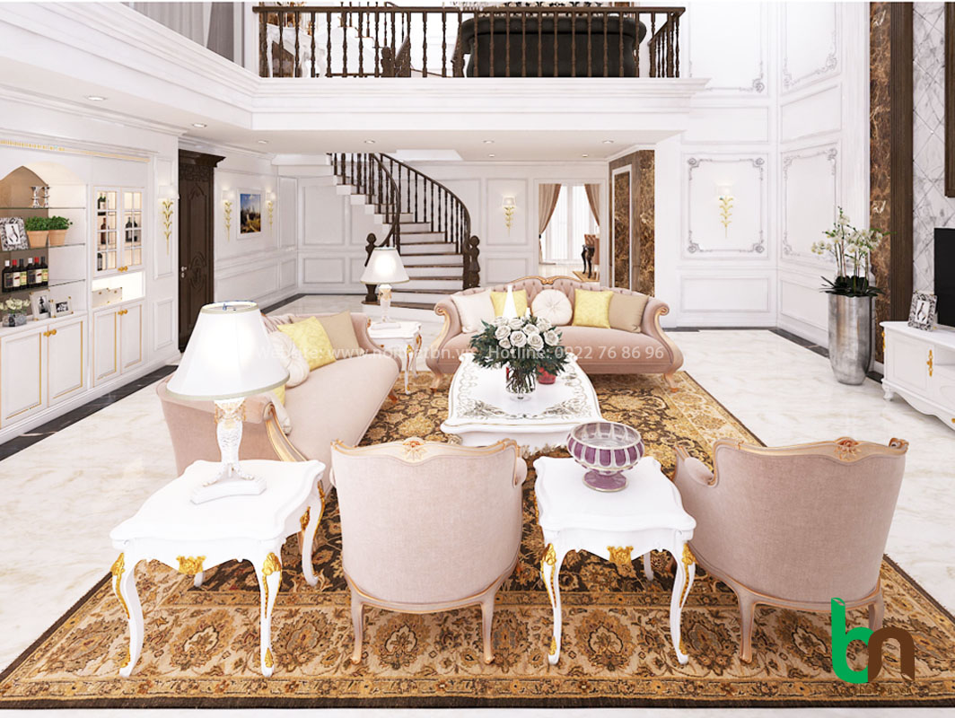 Nội thất phòng khách tân cổ điển sử dụng màu trắng, vàng, kem làm màu chủ đạo và kết hợp với các màu sắc như đen, xám, xanh rêu, đỏ booc-đô...mang đến một không gian sang trọng, quý phái và đẳng cấp.